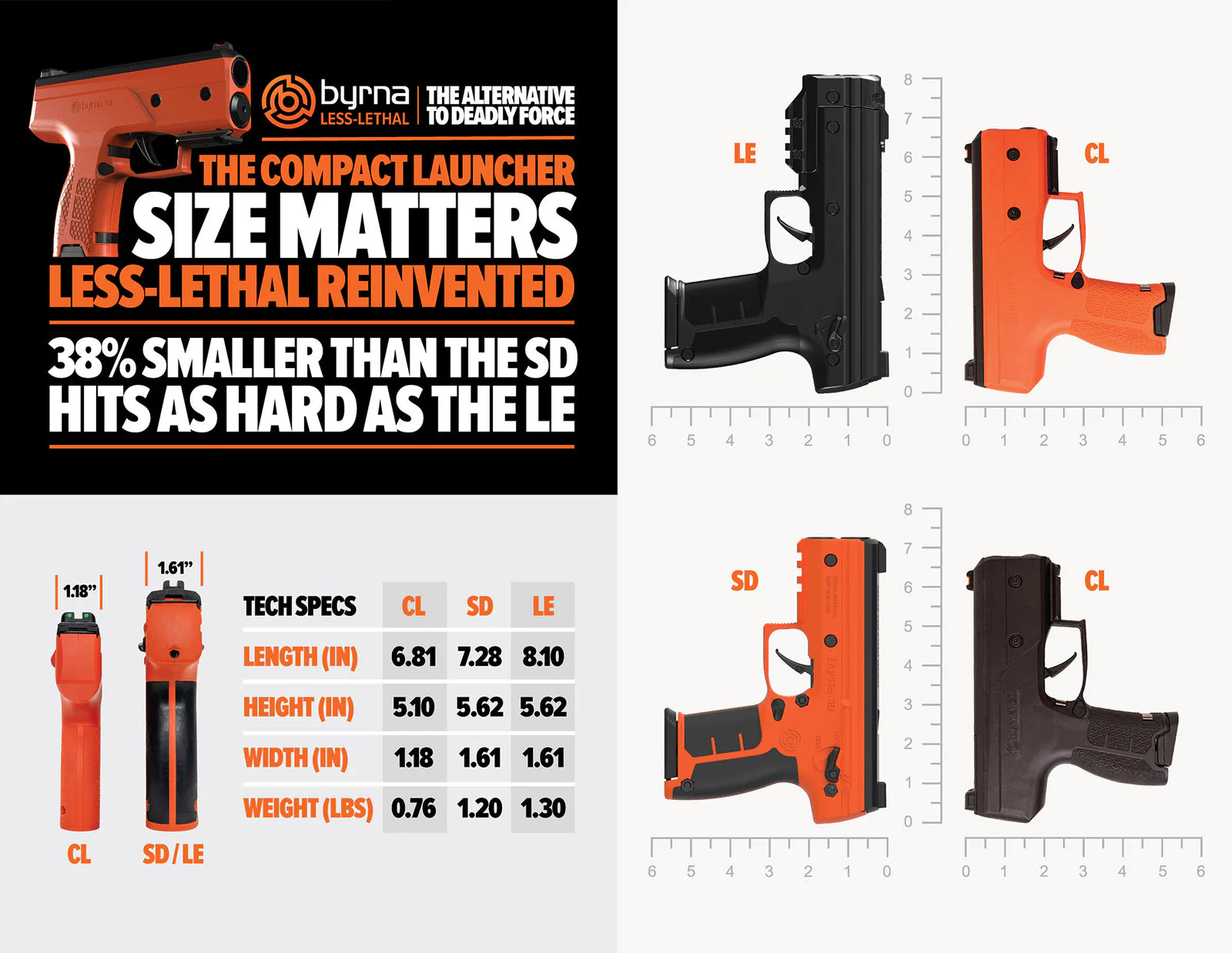 The Byrna CL (Compact Launcher) is the most compact less-lethal launcher in the world. The entire platform has been re-imagined for maximum concealability and stopping power. Powered by compressed air (CO2), the Byrna CL shoots .61 caliber round kinetic and/or chemical irritant projectiles that can disable a threat from up to 60-feet away.